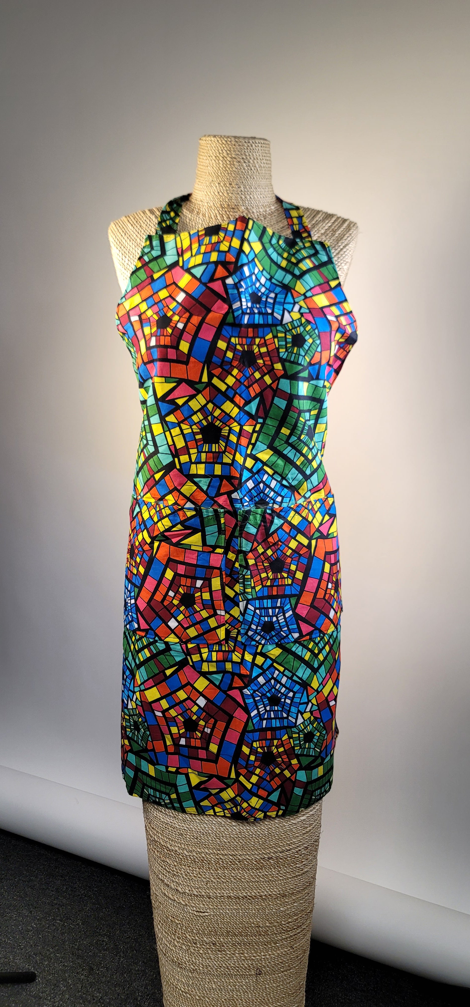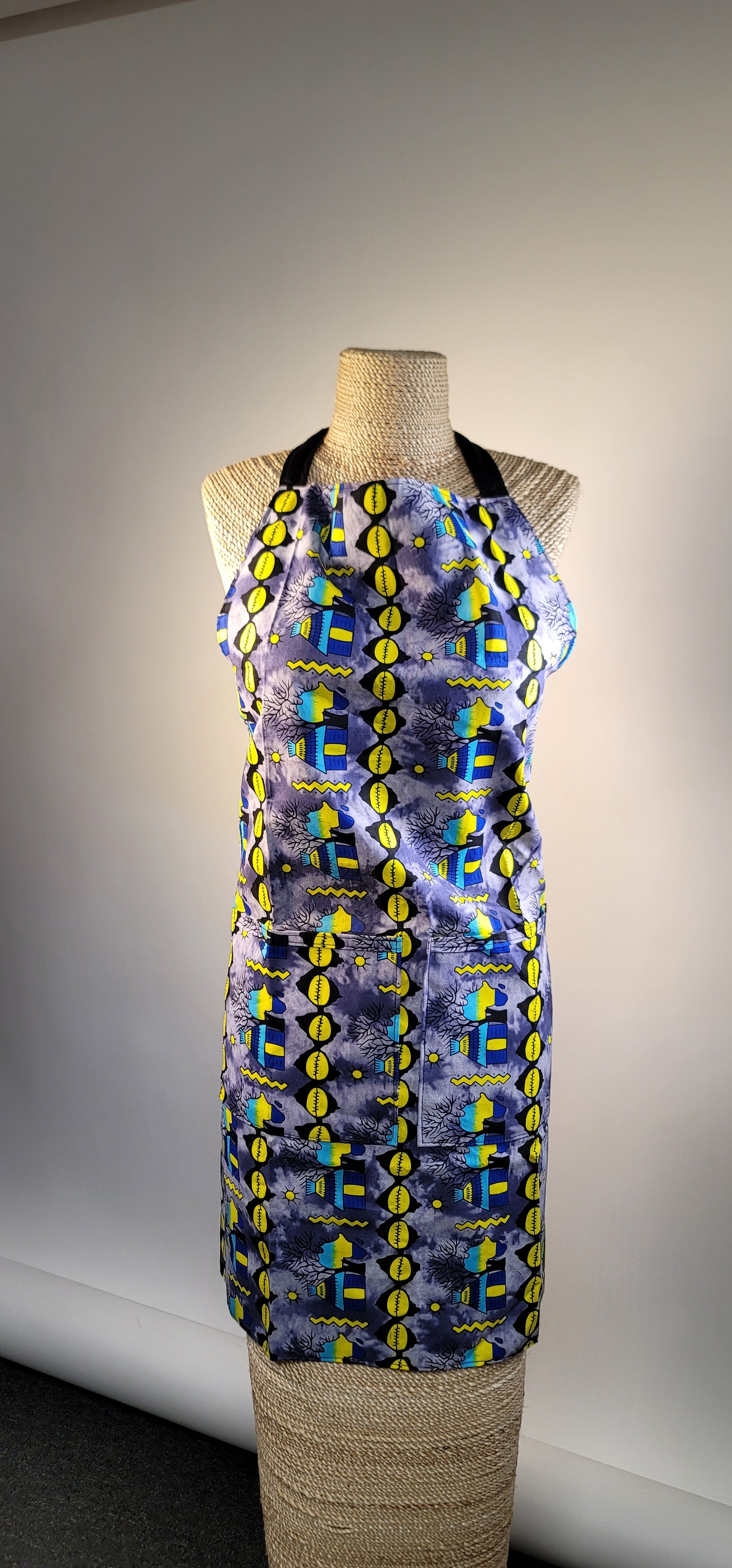 These African Print Aprons add a stylish and colorful touch to your kitchen attire. Made with traditional African print fabric, they are one size fits most and feature convenient pockets and ties. Machine washable for easy care. Perfect for the fashion-forward chef or home cook.