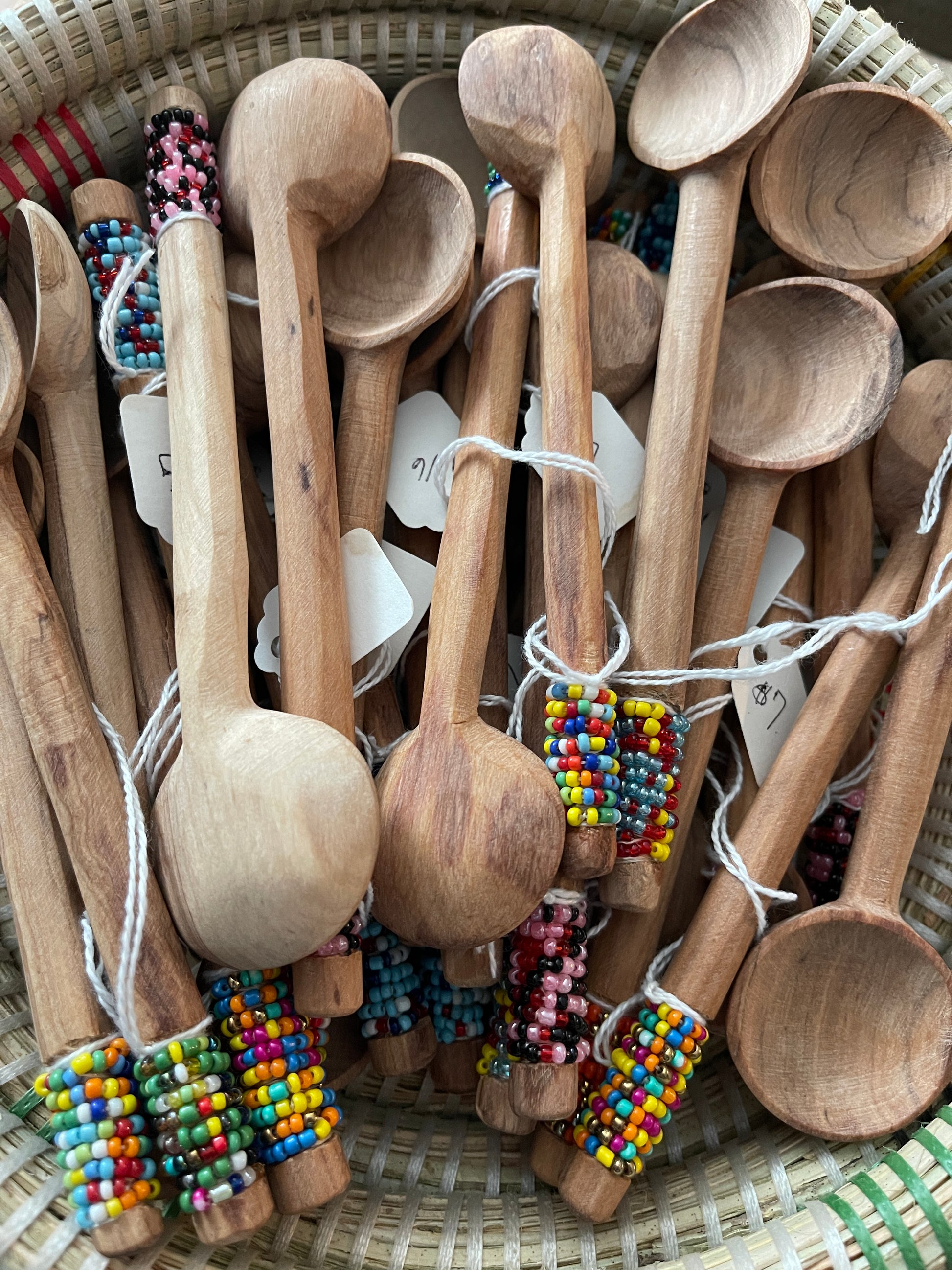 These spoons are carved from rosemary and olive wood in a rural area in Kenya then the bead embellishment is applied by the ladies from the Turkana tribe.